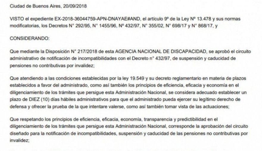 La resolución publicada ayer en el Boletín Oficial de la nación, señala que "mediante la Disposición Nº 217/2018 de esta Agencia Nacional de Discapacidad, se aprobó el circuito administrativo de notificación de incompatibilidades con el Decreto Nº 432/97, de suspensión y caducidad de pensiones no contributivas por invalidez".
