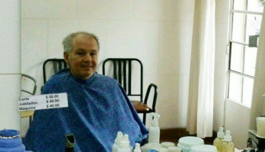 "Pachorra" pasó por una humilde peluquería y se hizo el corte de pelo posando para la cámara sonriente. En el vidrio se puede leer que el corte cuesta $50, mientras que para jubilados sale $40 y el corte con máquina sale $40.
