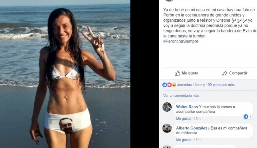 El traje de baño blanco, liso, tiene un solo detalle, que es el que llamó la atención de quienes distribuyeron la foto: en la parte inferior del bikini hay una estampa en negro con la cara del ex presidente y principal referente justicialista, Juan Domingo Perón.