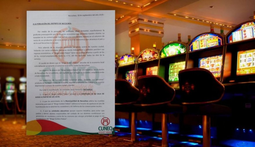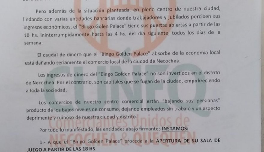 En la carta, remarcan que “en pleno centro de nuestra ciudad, lindando con varias entidades bancarias donde trabajadores y jubilados perciben sus ingresos económicos, el ‘Bingo Golden Palace’ tiene sus puertas abiertas a partir de las 10 hs. ininterrumpidamente hasta las 4 hs. del día siguiente, todos los días de la semana” y señalan que “el caudal de dinero que el ‘Bingo Golden Palace’ absorbe de la economía local está dañando seriamente el comercio local de la ciudad de Necochea”.