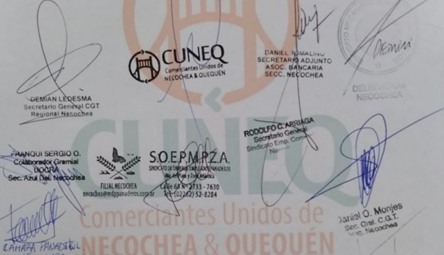 La nota abierta que Cuneq difundió a través de las redes sociales tiene importantes apoyos como el Sindicato Metalúrgico Delegación Necochea; Daniel Tomalino, Secretario adjunto Asoc. Bancaria; Sergio Franqui, Colaborador Gremial UOCRA; Rodolfo Arriaga, Sindicato Empleados de Comercio; Ariel Coronel, Sindicato de Panaderos; Elvio Favoretti, Cámara de Panaderos; Mario Lastra, Delegado Regional de UATRE; Daniel Monjes, Secretario Gral. CGT y Demián Ledesma, Secretario Gral CGT.