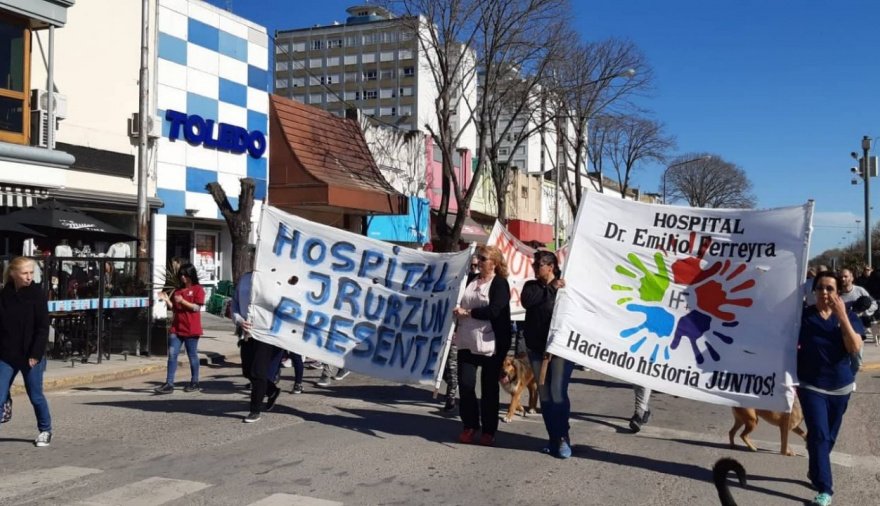 Un centenar de trabajadores del hospital municipal Dr Emilio Ferreyra se encolumnó esta mañana para marchar al Palacio Municipal de calle 56 en reclamo contra el desdoblamiento del pago de su salario y por la deuda en el arancelamiento hospitalario que aún no perciben.