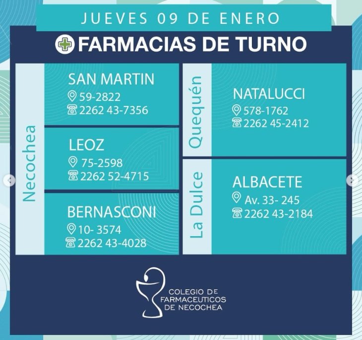 Estas son las 5 farmacias que estarán abiertas las 24 horas en Necochea, Quequén y La DUlce este jueves 9 de enero de 2025. Las farmacias estarán abiertas de 9AM de hoy a 9AM de mañana: