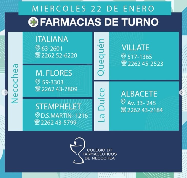 Estas serán las 5 farmacias que estarán de turno en Necochea, Quequén y La Dulce este miércoles 22 de enero de 2025. Las farmacias estarán disponibles de 9AM de hoy a 9AM de mañana: