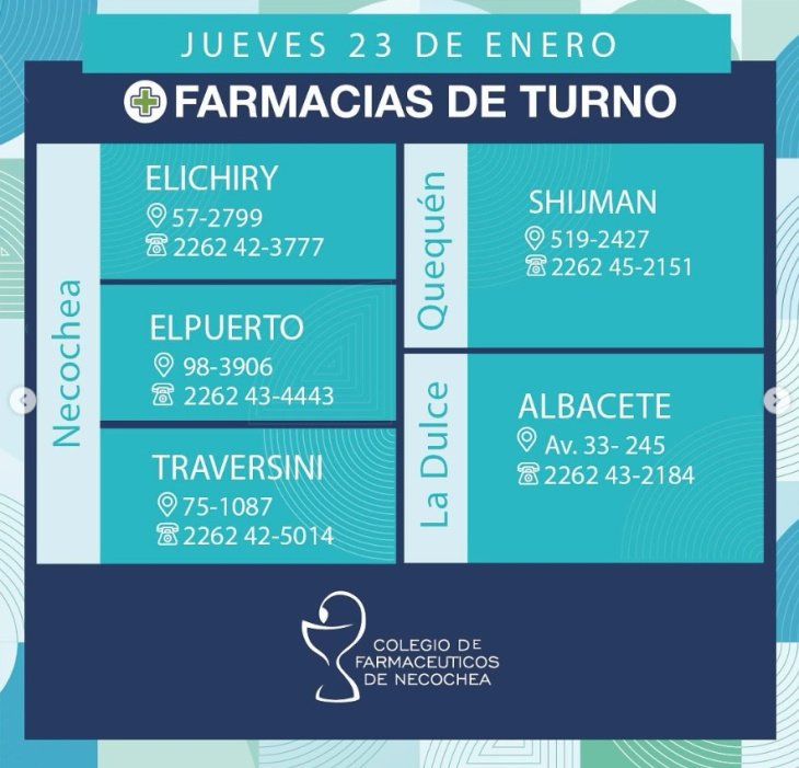 Estas son las 5 farmacias que estarán de turno en Necochea, Quequén y La Dulce este jueves 23 de enero de 2025 según el COlegiod e Farmacéuticos. Las farmacias estarán abiertas de 9AM de hoy a 9AM de mañana: