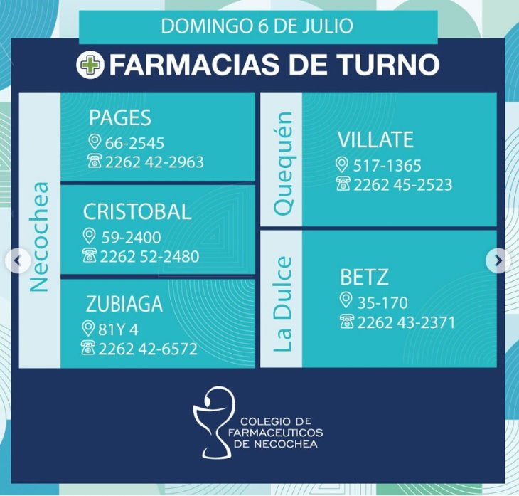 Estas son las farmacias que estarán de turno este domingo 6 de junio de 2025 en Necochea, Quequén y La DUlce. LAs farmacias permanecerán abiertas las 24 horas de corrido, de 9AM de hoy a 9AM de mañana: