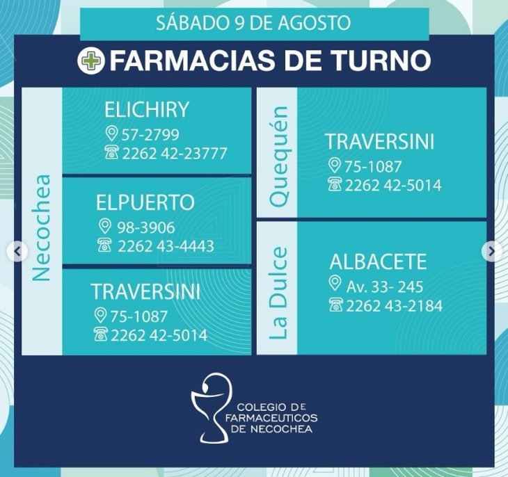 Farmacias de turno en Necochea y Quequén este sábado 9-08