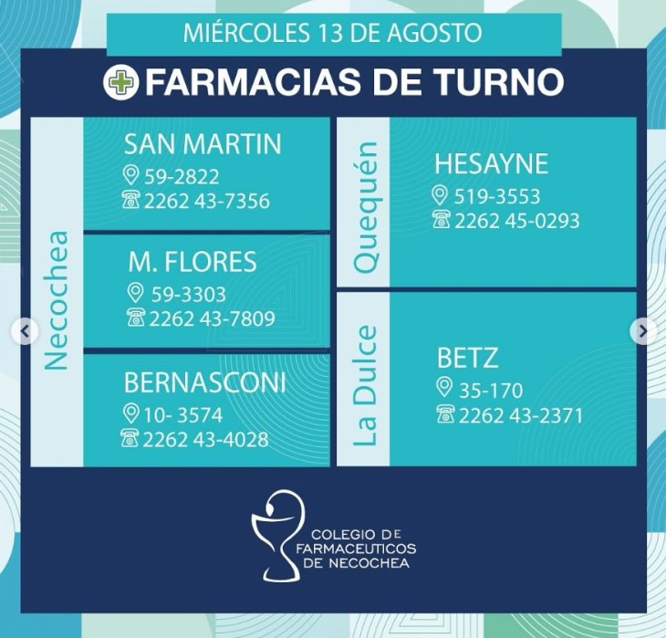 Estas son las 5 farmacias que estarán de turno abiertas las 24 horas este miércoles 13 de agosto de 2025 en Necochea, Quequén y La Dulce: