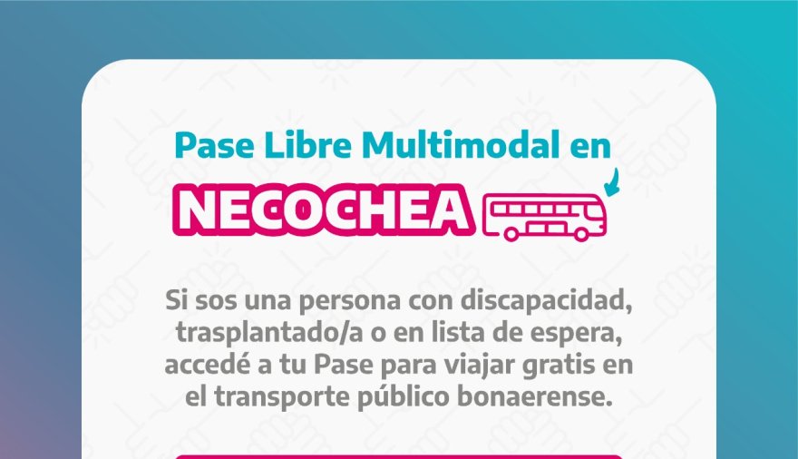 "Durante la mañana de este miércoles 20 de agosto, entre las 9 y las 11.30, si sos una persona con discapacidad, trasplantada o en lista de espera, accedé a tu Pase para viajar gratis en el transporte público bonaerense. Acercate con tu DNI, CUD o credencial INCUCAI, al SUM del Consorcio del Puerto de Quequen ubicado en Av. Juan de Garay 850", invitó el consorcio en un llamado a la comunidad.