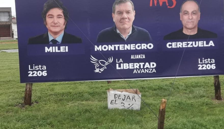 En Necochea también hay escarnio: a pesar de haber seis listas prolibertarias (oficiales, aliadas y subsidiarias) hubo escrache sobre un cartel publicitario de La Libertad Avanza en el ingreso necochense del Puente Dardo Rocha al que le dejaron abajo una caja con la inscripción "Dejar el 3%".