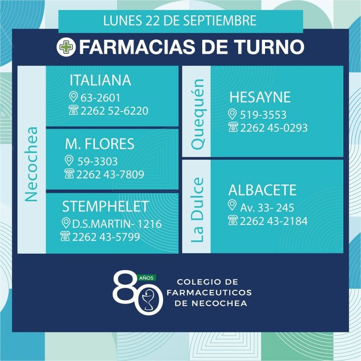 Estas son las 5 farmacias que estarán de turno en Necochea, Quequén y La Dulce este lunes 22 de septiembre de 2025. Las farmacias permanecerán abiertas de 9 am del lunes a 9 am del martes: