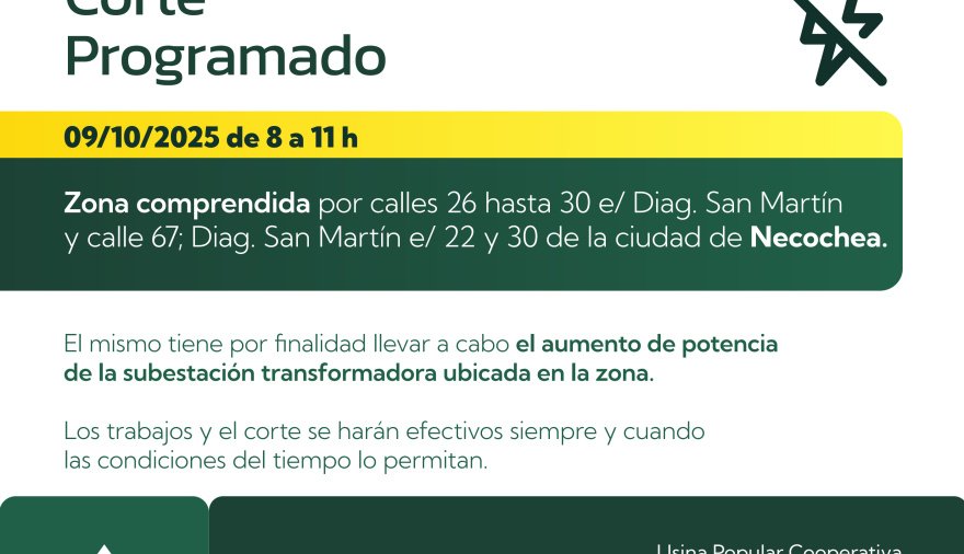 La Usina Popular Cooperativa “Sebastián de María” informó que el próximo jueves 9 de octubre se llevará a cabo un corte programado de energía eléctrica en un sector de la ciudad de Necochea.