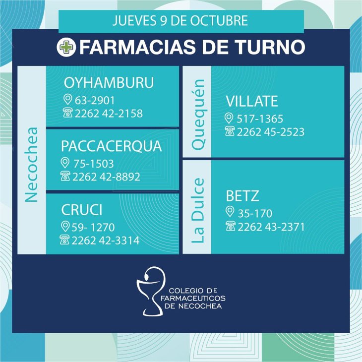 Estas son las 5 farmacias que estarán de turno en Necochea, Quequén y La Dulce este jueves 9 octubre de 2025. Las farmacias permanecerán abiertas de 9 am del jueves a 9 am del viernes: