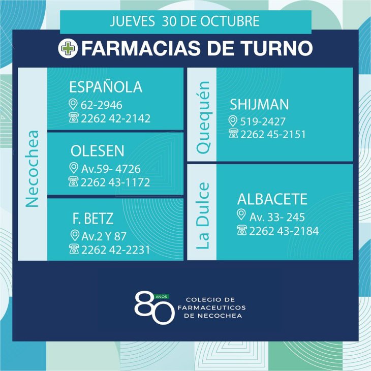 Estas son las 5 farmacias que estarán de turno en Necochea, Quequén y La Dulce este jueves 30 octubre de 2025. Las farmacias permanecerán abiertas de 9 am del jueves a 9 am del viernes: