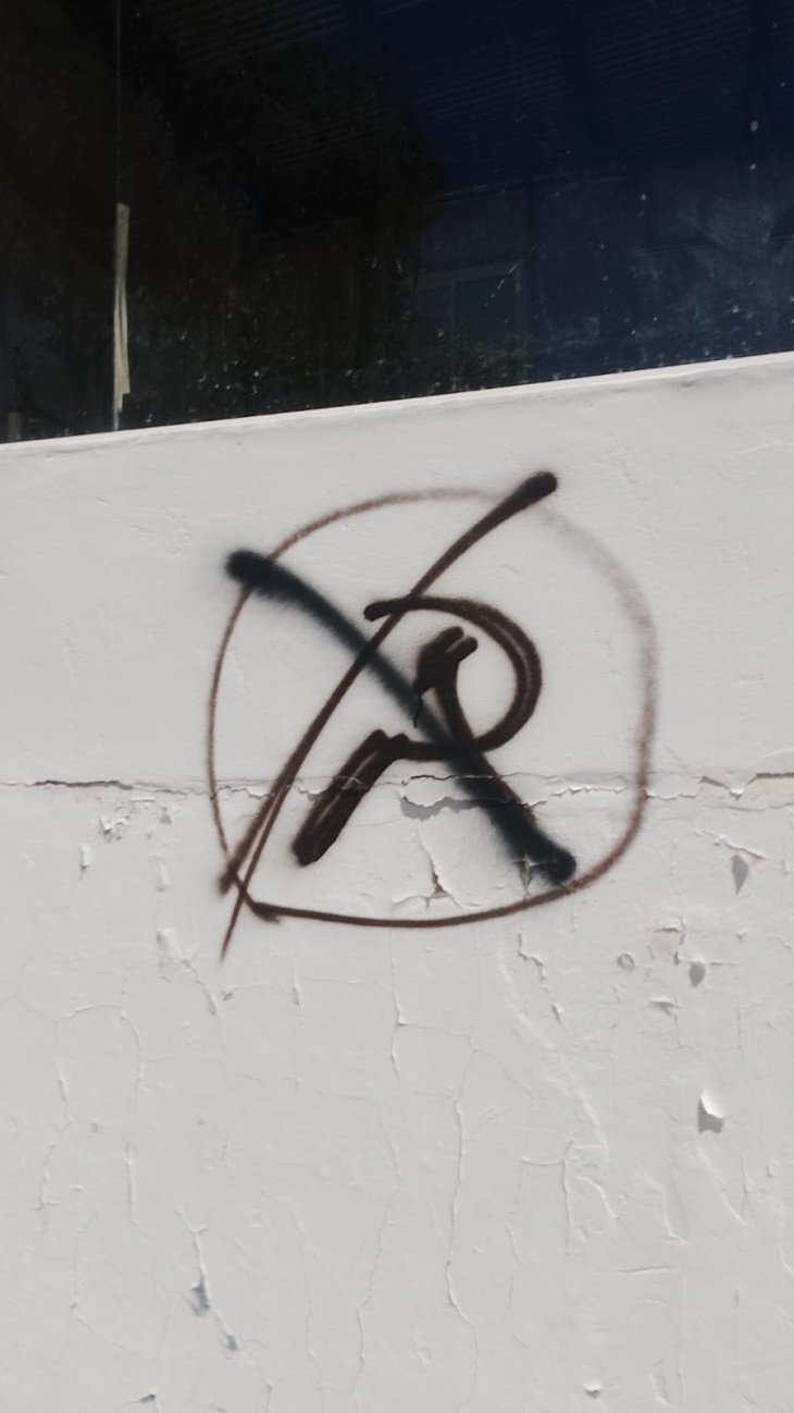 Además de las roturas de vidrios, se registraron pintadas con aerosol con consignas que dan cuenta de la intencionalidad política del ataque: una de las paredes apareció con un pintada tachando un símbolo mal dibujado de lo que serían la hoz y el martillo que aparecía en la bandera de la ex Unión Soviética, como si las escuelas estatales fueran edificios comunistas.