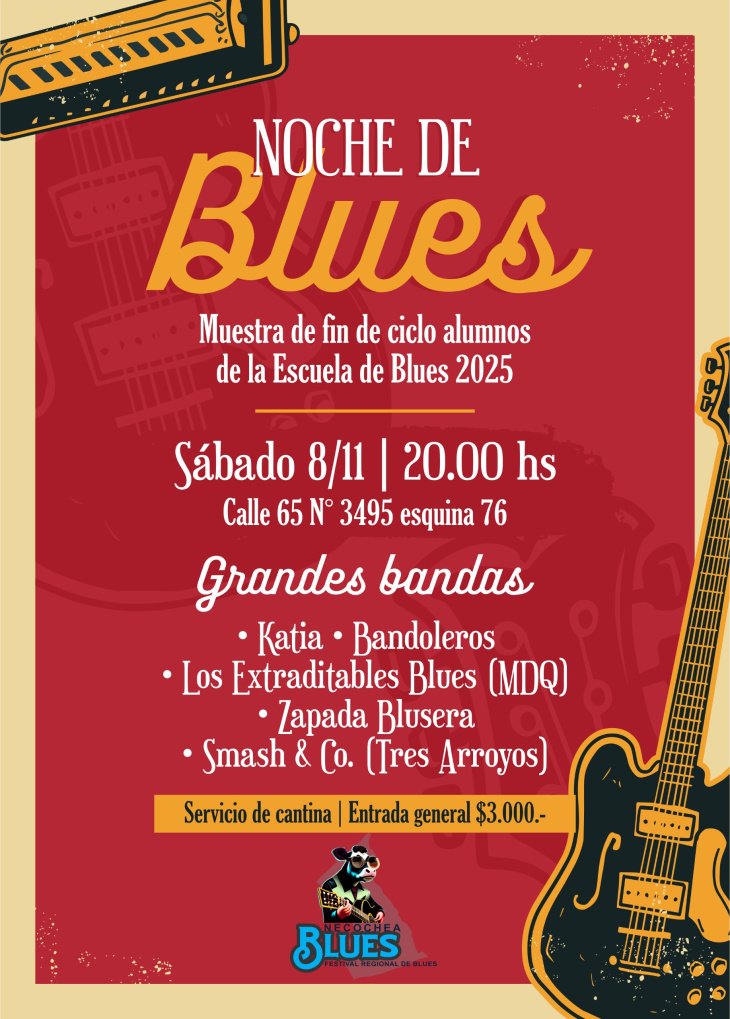 Este sábado, 8 de noviembre, a partir de las 20 hs, los alumnos de la Escuela de Blues realizarán la muestra de fin de año, un espectáculo en el que también se presentarán bandas y artistas de la zona como Katia (rock/blues), Bandoleros (country/blues), Los Extraditables Blues (Mar del Plata) y Smash & Co. (delta blues, Tres Arroyos); además, habrá una zapada blusera con músicos de distintas agrupaciones. El evento tendrá lugar en el Centro de Jubilados y Pensionados de Barrio Oeste, ubicado en calle 65 n°3495 (esquina 76). El evento, cuya entrada general cuesta $3.000, contará con servicio de cantina.