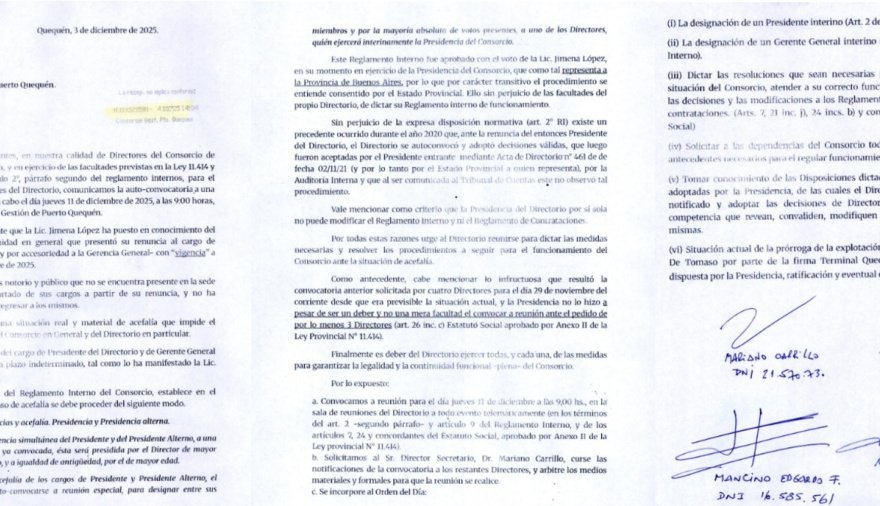 La convocatoria lleva la firma de cuatro directores: el gerente de Terminal Quequén, Daniel Arce; la del director de Coninagro, Juan Ouwerkerk; y de los representantes sindicales Mariano Carrillo y Edgardo Mancino.