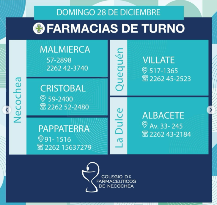 El Colegio de Farmacéuticos de Necochea informó que estos serán los dispensarios de turno en Necochea y Quequén este domingo 28 de diciembre de 2025.
