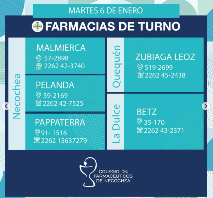 El Colegio de Farmacéuticos de Necochea informó que estos serán los dispensarios de turno en Necochea y Quequén este martes 6 de enero de 2026.