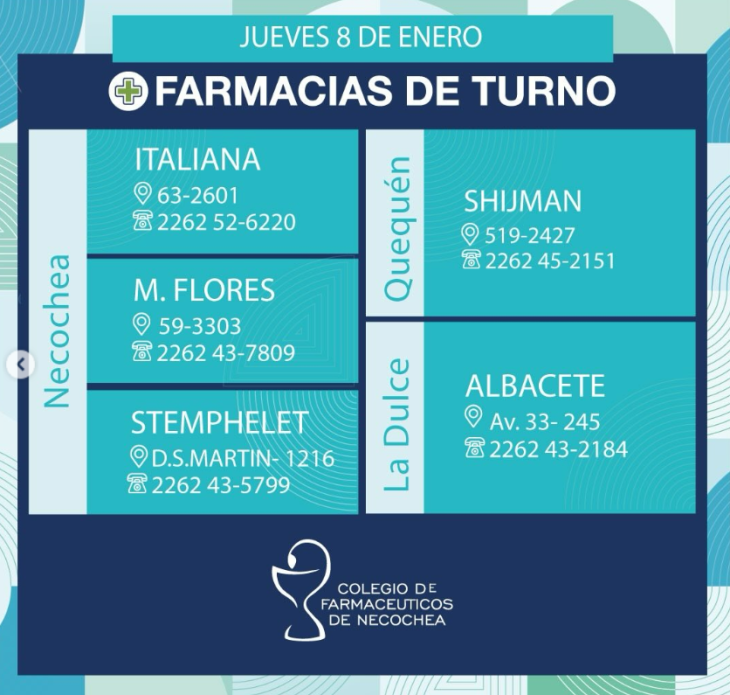 El Colegio de Farmacéuticos de Necochea informó que estos serán los dispensarios de turno en Necochea y Quequén este jueves 8 de enero de 2026.