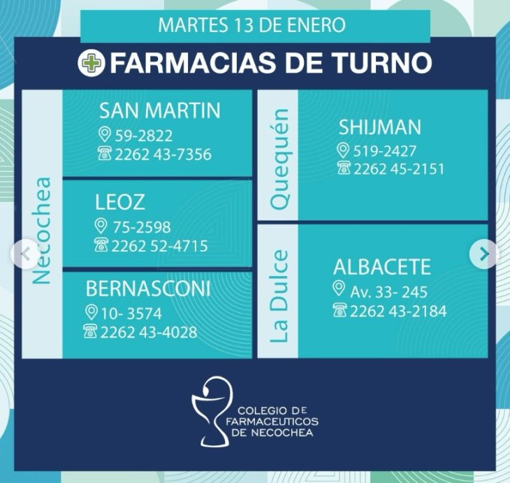 Estas son las 5 farmacias que estarán de turno en nuestro distrito este martes 13 de enero de 2025. Los dispensarios estarán disponibles de 9Am de hoy a 9Am de mañana en Necochea, Quequén y La Dulce:
