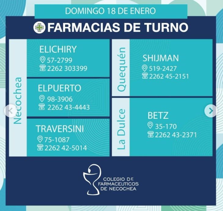Estas serán las 5 farmacias de turno en Necochea, Quequén y La DUlce este domingo 18 de enero de 2025. Las farmacias estarán abiertas 24 horas de corrido, de 9AM de hoy a 9AM de mañana: