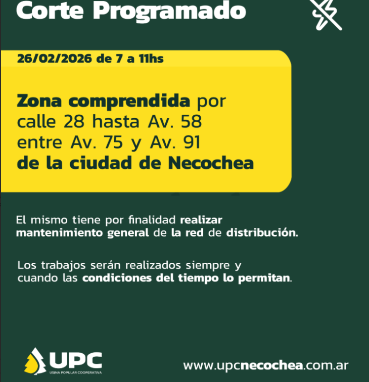 La Usina Popular Cooperativa (UPC) informó que este miércoles 26 de febrero de 2026 se realizará un corte programado del servicio eléctrico en un sector de la ciudad de Necochea, con motivo de tareas de mantenimiento general en la red de distribución.