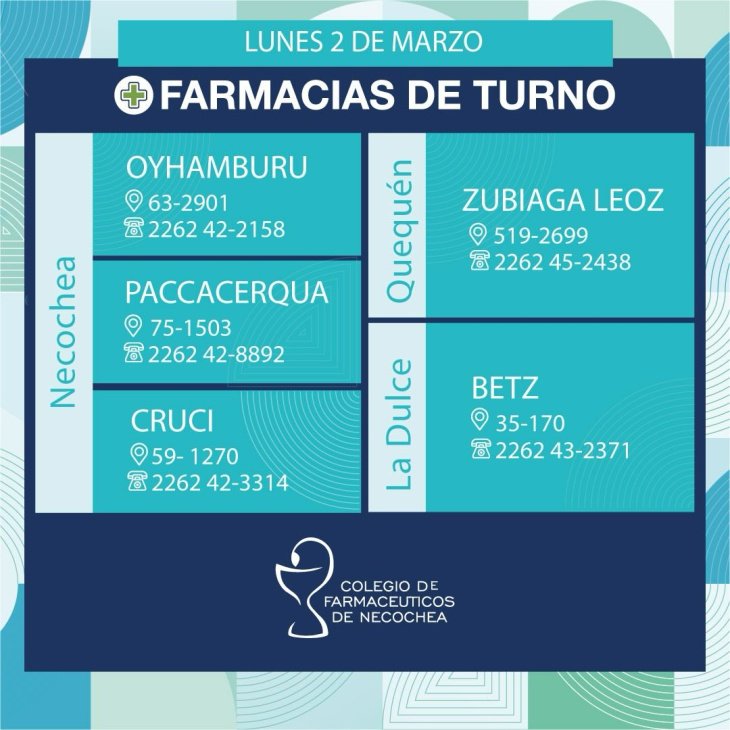 Estas son las 5 farmacias que estarán abiertas las 24 horas del día en Necochea, Quequén y La Dulce este lunes 2 de marzo de 2026. Las farmacias permanecerán abiertas toda la jornada, de 9AM de hoy a 9AM de mañana: