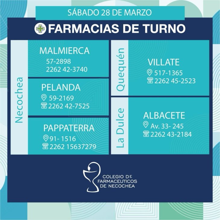 Estas serán las 9 farmacias de turno en Necochea, Quequén y La Dulce este sábado 28 de marzo de 2026. El Colegio de Farmacéuticos informa que las farmacias de turno permanecen abiertas de 9 AM de hoy a 9AM de mañana.