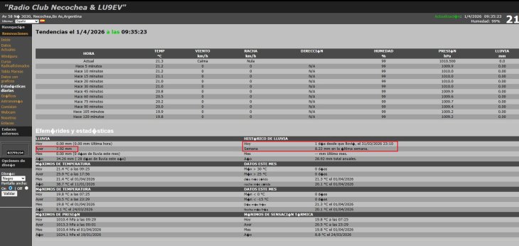 Según el Radio Club Necochea, que tiene instalada una estación meteorológica propia, la suma de lluvia acumulada ayer fue de 7,92 mm, sumando los dos chaparrones, uno al mediodía y otro cerca de la medianoche. El promedio registrado en toda la semana fue de 8,22 mm.