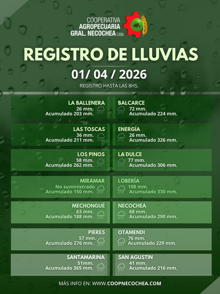 Por otro lado, la medición de la Cooperativa Agropecaria Mariano Necochea arrojó 68mm de lluvia, aunque sus mediciones no calculadas para el área rural del distrito.