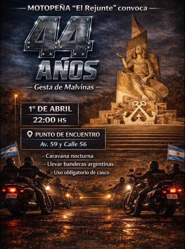 La Motopeña "El Rejunte" lanzó una convocatoria abierta a toda la comunidad para participar de una Caravana Nocturna, con banderas argentinas, con el propósito de conmemorar el 44° Aniversario de la Guerra de Malvinas. Este evento busca reunir a moteros independientes, agrupaciones, clubes y vehículos particulares en un gesto de hermandad para homenajear a los héroes que participaron en el conflicto.