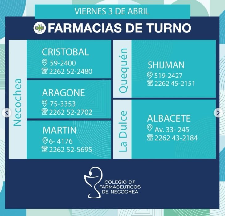 Estas serán las 9 farmacias de turno en Necochea, Quequén y La Dulce este viernes 3 de abril de 2026. El Colegio de Farmacéuticos informa que las farmacias de turno permanecen abiertas de 9 AM de hoy a 9AM de mañana.