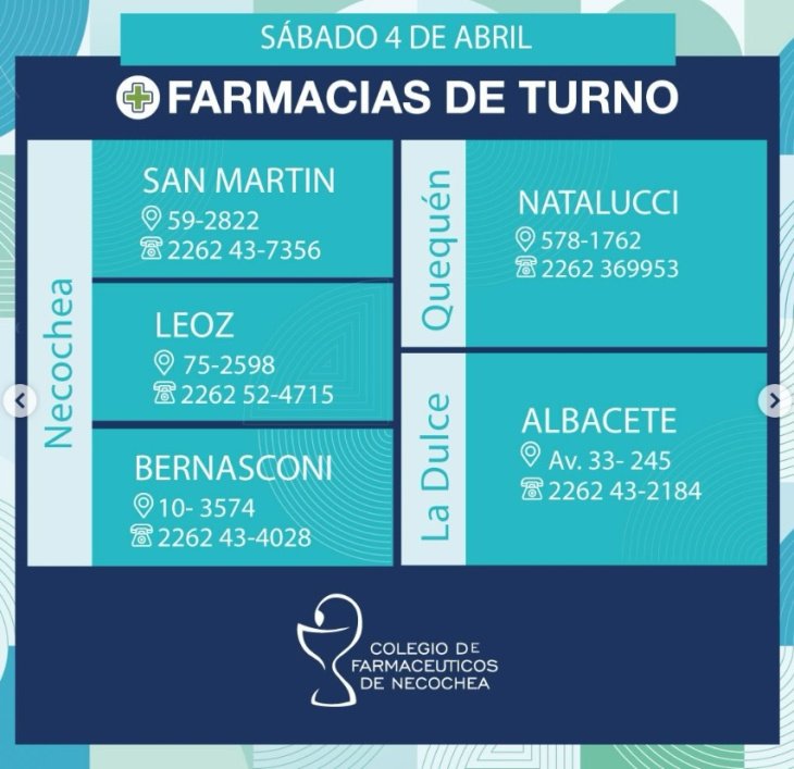 Estas serán las 5 farmacias de turno en Necochea, Quequén y La Dulce este sábado 4 de abril de 2026. Las farmacias permanecerán abiertas de 9AM de hoy a 9AM de mañana: