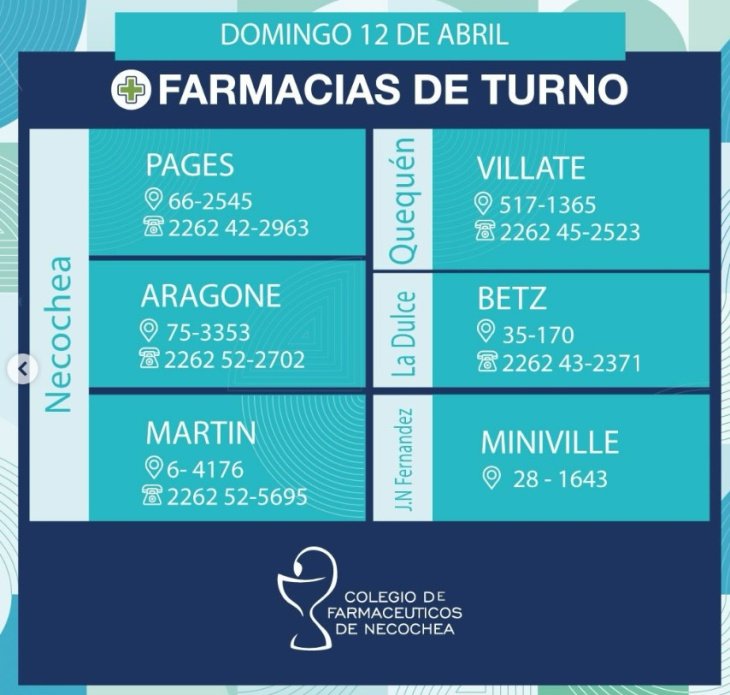 Estas son las 5 farmacias que estarán de turno las 24 horas en Necochea, Quequén y La Dulce este domingo 12 de abril de 2026: