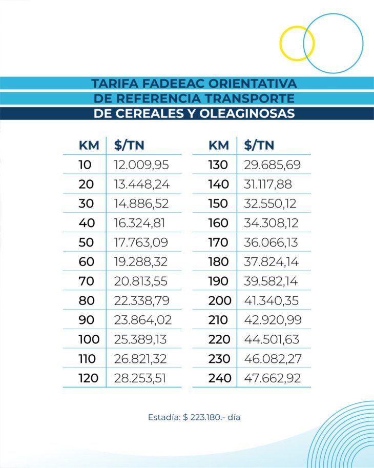 A esto se suma el costo de estadía, fijado en 223.180 pesos diarios, que impacta cuando se registran demoras en los procesos de carga y descarga.