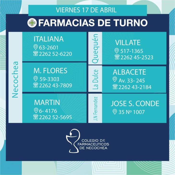 Estas son las 5 farmacias que estarán de turno las 24 horas en Necochea, Quequén, Juan N Fernández y La Dulce este jueves 16 de abril de 2026: